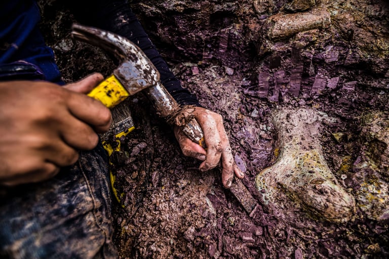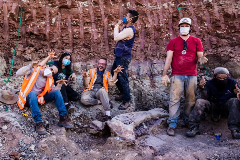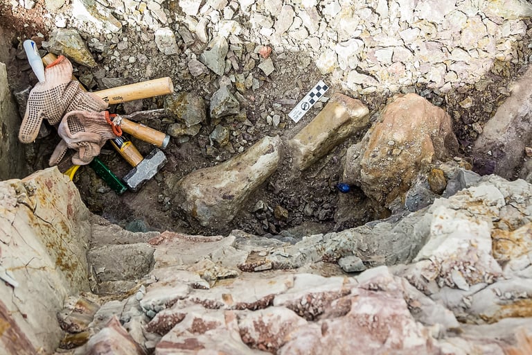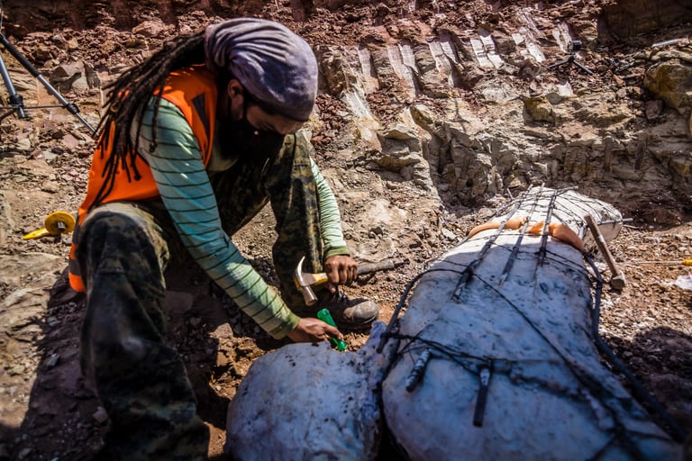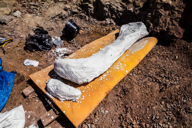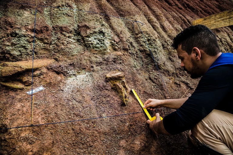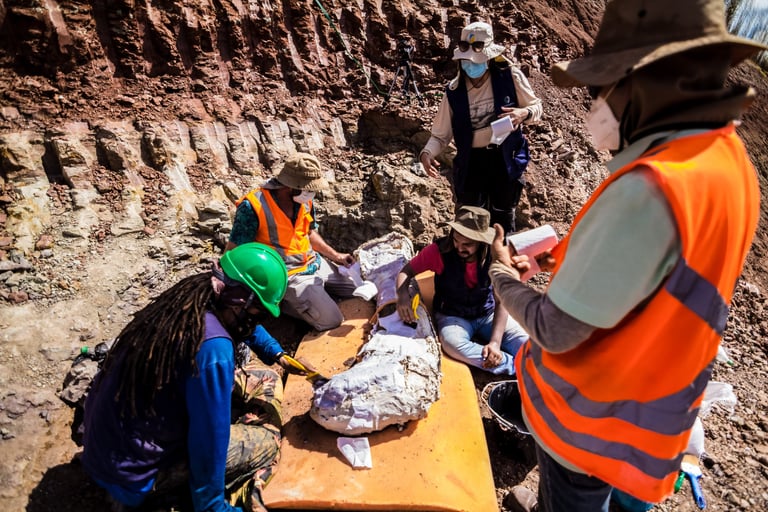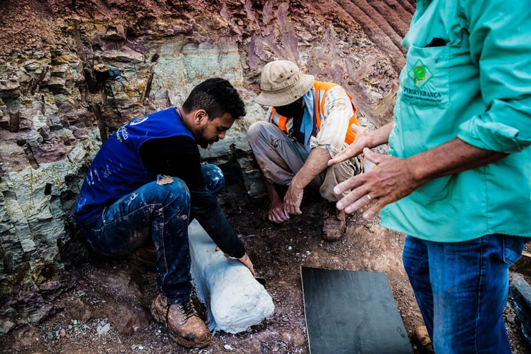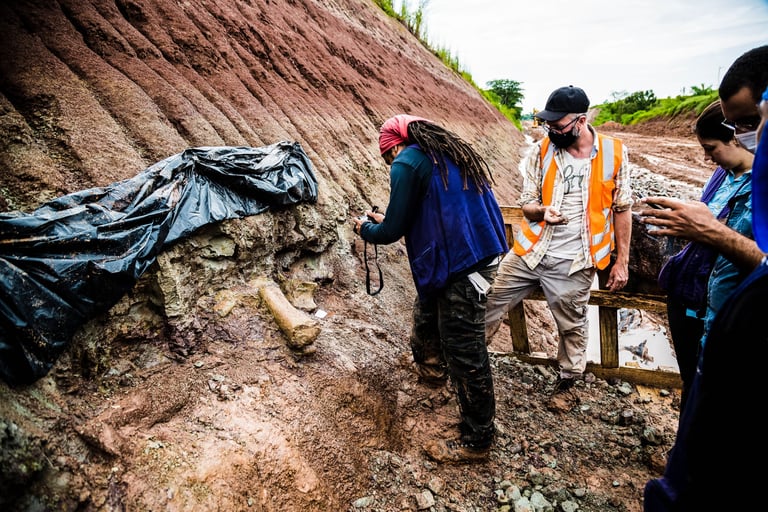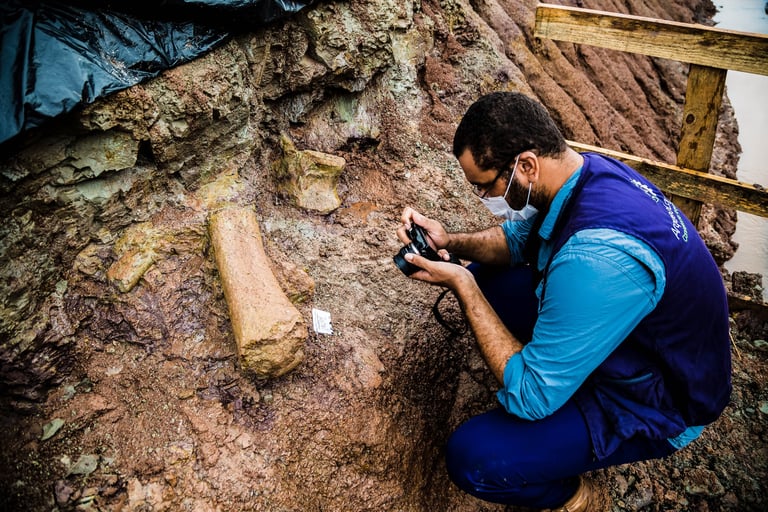 Em abril de 2021, a convite da Master Ambiental, seguimos para Davinópolis, Maranhão, e registramos uma escavação paleontológica surpreendente. Durante as obras do Terminal Ferroviário da Brado, o arqueólogo em campo identificou um osso como fóssil – inicialmente, a hipótese era de uma Preguiça Gigante, um animal da megafauna. Mas, à medida que a escavação avançava, os ossos, cada vez maiores, revelavam que o animal era muito maior. O geólogo em campo confirmou: estávamos diante de relíquias do período Cretáceo, há mais de 100 milhões de anos, comprovando a descoberta de um dinossauro.