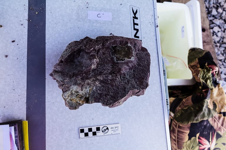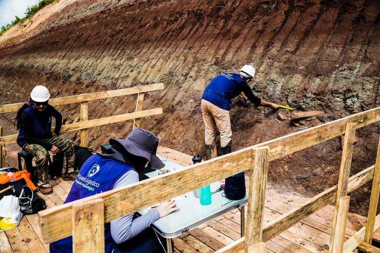 Durante a primeira fase da escavação, encontramos diversas peças, dentre elas um fóssil de cerca de 70 cm. Após uma semana intensa de trabalho sob as chuvas do inverno amazônico, concluímos essa etapa. Aproximadamente um mês depois, retornamos à área e nos deparamos com uma paisagem completamente transformada, em busca de fragmentos ainda maiores.